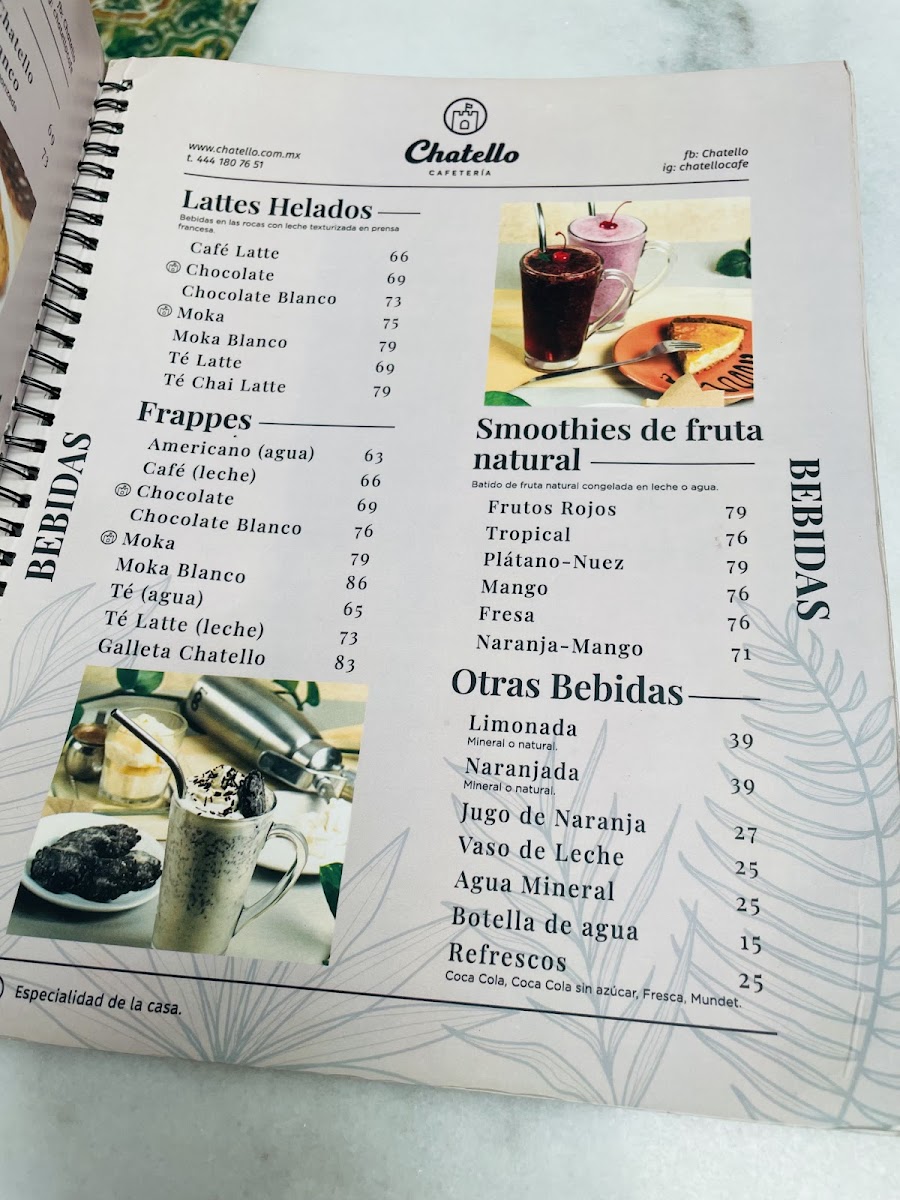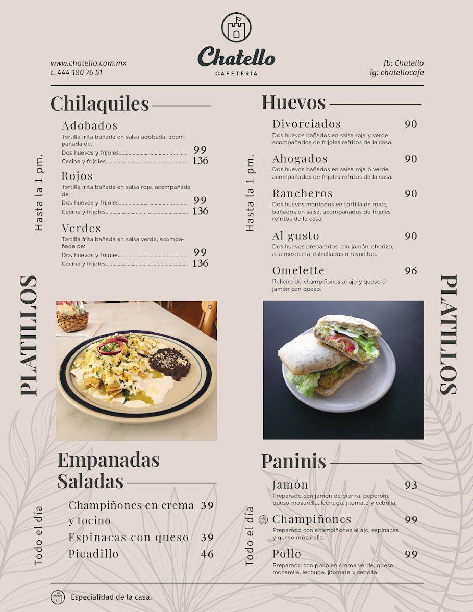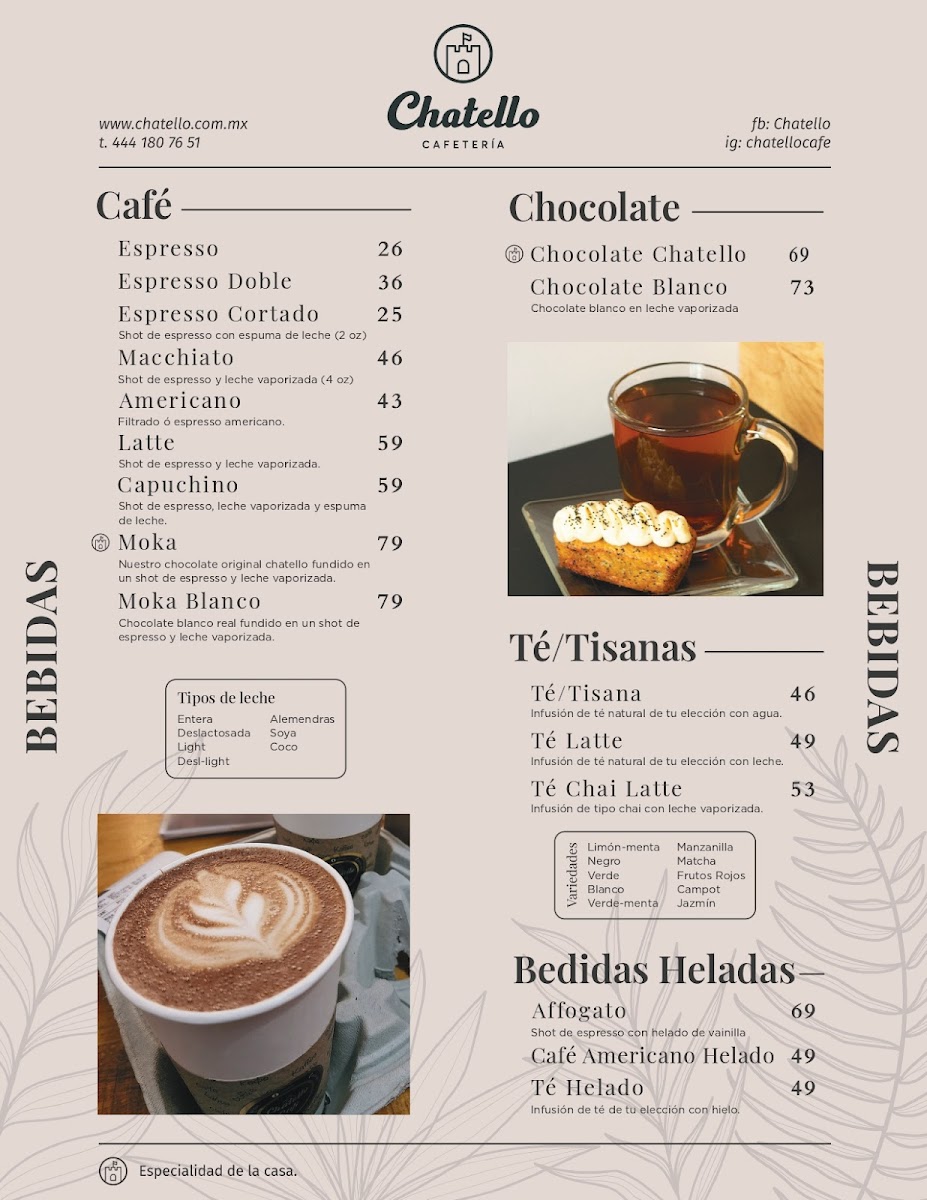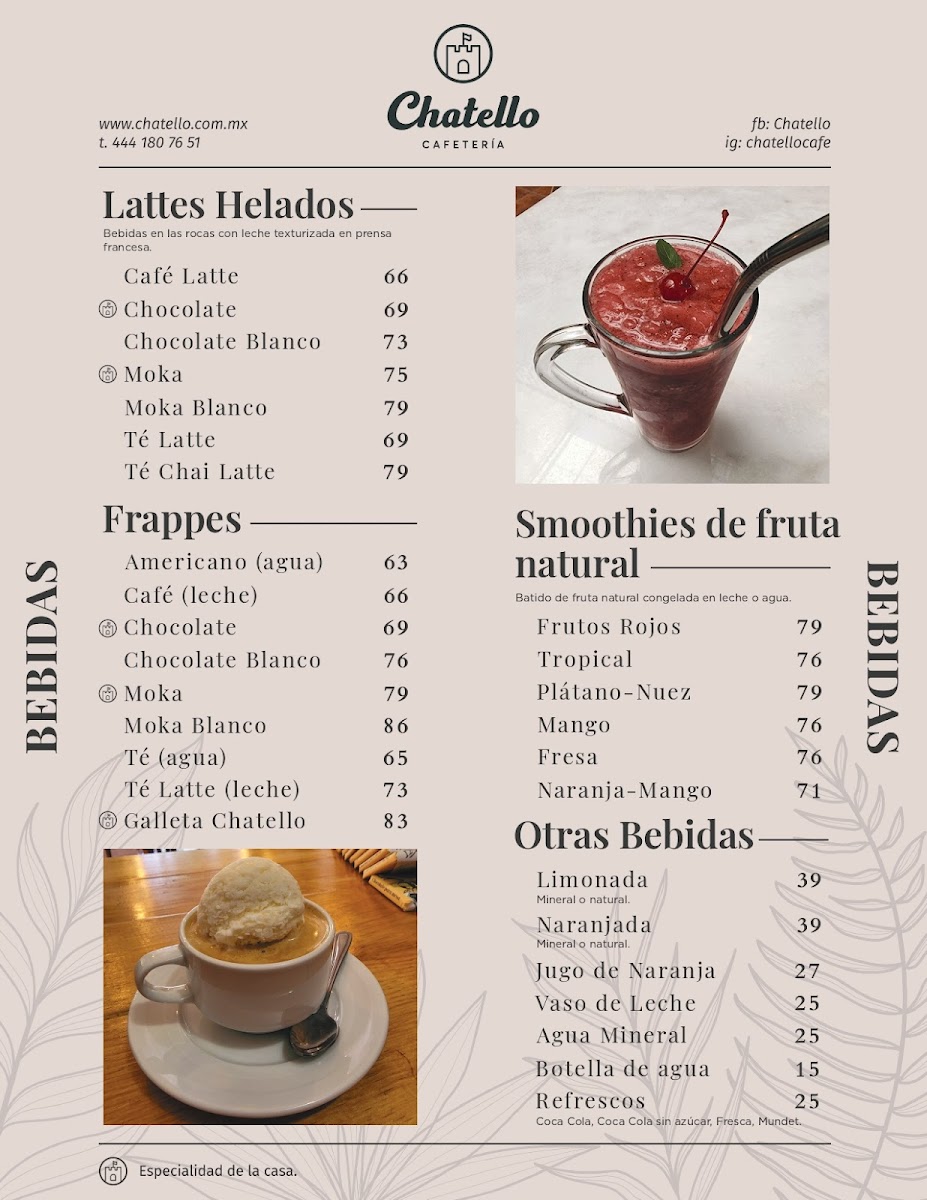 Chatello Cafetería in Tequisquiapan offers a delightful variety of beverages, snacks, and meals that cater to different tastes. For coffee lovers, the frappes stand out with options like Frappe De Te Latte and Frappe Moka (price not listed), offering a sweet and creamy way to start your day. If you're in the mood for something a little more indulgent, the Affogato and Rebanada De Pay De Queso are sure to satisfy your sweet tooth. The Combos Chatello provide excellent value, with choices such as Inicia Bien Tu Día and Chatello Especial that combine refreshing drinks and tasty snacks. If you're looking for a fruitier option, the smoothies like Smoothie De Fresa and Smoothie Platano-Nuez are perfect for a refreshing burst of flavor. For those who prefer something more substantial, Chatello's Mollete and Panini offer hearty bites. As for breakfast, the traditional Huevos Rancheros or the healthier Omelette De Espinaca are ideal choices. For those who crave chilled drinks, the Te Chai Latte Helado and Americano Helado offer a cool and satisfying experience. Whether you're visiting for a quick snack, a fulfilling meal, or just to enjoy a cozy beverage, Chatello Cafetería’s menu has something for every preference.