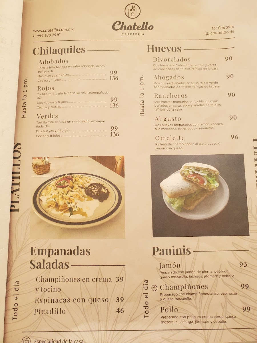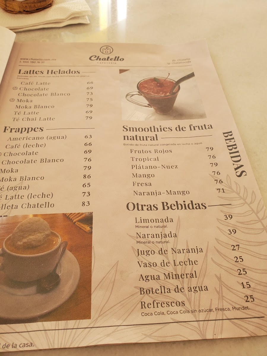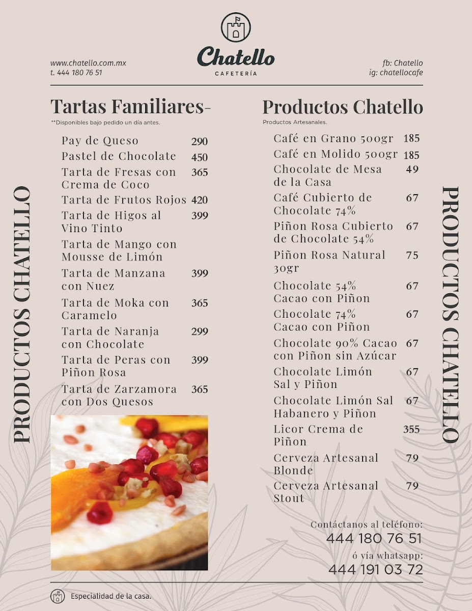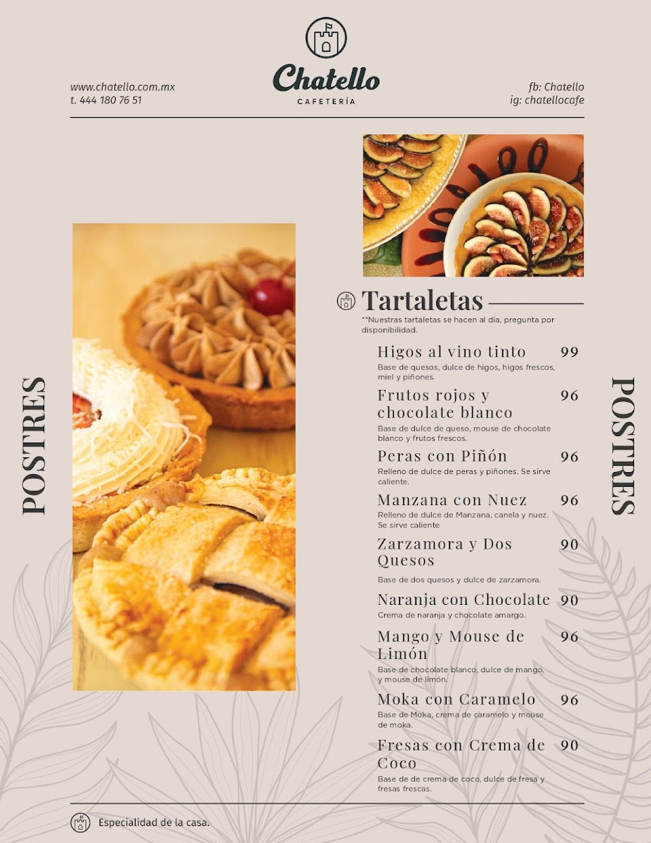 Chatello Cafetería in Tequisquiapan offers a delightful variety of beverages, snacks, and meals that cater to different tastes. For coffee lovers, the frappes stand out with options like Frappe De Te Latte and Frappe Moka (price not listed), offering a sweet and creamy way to start your day. If you're in the mood for something a little more indulgent, the Affogato and Rebanada De Pay De Queso are sure to satisfy your sweet tooth. The Combos Chatello provide excellent value, with choices such as Inicia Bien Tu Día and Chatello Especial that combine refreshing drinks and tasty snacks. If you're looking for a fruitier option, the smoothies like Smoothie De Fresa and Smoothie Platano-Nuez are perfect for a refreshing burst of flavor. For those who prefer something more substantial, Chatello's Mollete and Panini offer hearty bites. As for breakfast, the traditional Huevos Rancheros or the healthier Omelette De Espinaca are ideal choices. For those who crave chilled drinks, the Te Chai Latte Helado and Americano Helado offer a cool and satisfying experience. Whether you're visiting for a quick snack, a fulfilling meal, or just to enjoy a cozy beverage, Chatello Cafetería’s menu has something for every preference.