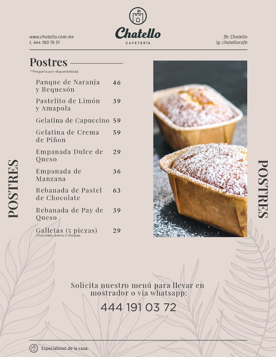 Disfruta de una bebida grande de chatello de tu elección, acompañado por alguno de nuestros postres.